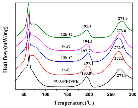 Figure 5 describes the DSC curves of as-prepared and crosslinked FK/PVA/PEO nanofiber membranes. The endothermic peaks of the FK/PVA/PEO nanofiber membranes were observed between 50 and 80 °C. The peaks at ~60 °C and ~80 °C correspond to the melting of the PEO crystalline phase and the evaporation of water, respectively [26,27]. The peaks at ~200 °C and ~270 °C refer to the PVA melting and FK endothermic peaks, respectively [26]. Both PVA melting and FK endothermic peaks have been shifted towards higher temperature after vapor-assisted crosslinking modification of FK/PVA/PEO nanofiber membranes. The results indicate that the thermal stability of crosslinked FK/PVA/PEO nanofiber membrane has been improved, which is consistent with the TGA results, given in Figure 4.