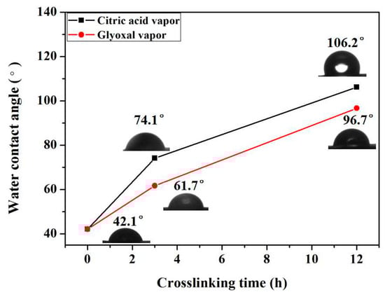 Water contact angle (WCA) is an important measurement to assess the water absorption and swelling properties of polymeric membranes. The WCA of the as-prepared and crosslinked FK/PVA/PEO nanofiber membranes is shown in Figure 6. The WCA of as-prepared FK/PVA/PEO nanofiber membrane is 42.1°, whereas the WCA dramatically increased to 106.2° and 96.7° after vapor-assisted crosslinking modification for 12 h with citric acid and glyoxal, respectively. Moreover, the WCA has shown a direct relationship with reaction time for both crosslinkers. The results suggest that the crosslinking has significantly improved the water resistance of the nanofiber membrane, which can be attributed to the chemical interactions of membrane materials and crosslinkers. In addition, the water resistance of the citric-treated membranes is higher than glyoxal-treated membranes.