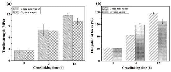 The mechanical properties of as-prepared and crosslinked FK/PVA/PEO nanofiber membranes are presented in Figure 7. The mechanical properties, such as tensile strength (σb) and elongation at breakage point (εb), were deduced from linear stress-strain curves. Figure 7 shows that the σb and εb of the as-prepared FK/PVA/PEO nanofiber membrane are 2.62 MPa and 42.75%, respectively. Both σb and εb have increased after crosslinking and showed a direct relationship with crosslinking time. The σb of the nanofiber membranes, treated with citric acid vapors and glyoxal vapors for 12 h, are about 4.5 times and 3.8 times higher than that of the as-prepared FK/PVA/PEO nanofiber membrane, respectively. Furthermore, the εb of 12h-C and 12h-G is about 3.7 times and 3.0 times higher than that of the as-prepared FK/PVA/PEO nanofiber membrane, respectively. The results indicate that the σb and εb of nanofiber membrane significantly increased by vapor crosslinking modification, which may be caused due to the reactions between the crosslinkers and the FK/PVA/PEO nanofiber membrane. As a result of this interaction, a large number of crosslinking chains were formed and enhanced mechanical properties were observed [28]. Moreover, Figure 7 reveals that the mechanical properties of citric-treated membranes are better than glyoxal-treated membranes, which may be ascribed to the larger diameter of the citric-treated nanofibers. Additionally, the error bars in Figure 7 were achieved by measuring approximately 20 pieces of independently-prepared nanofiber membranes. As can be seen from Figure 7 shown through error bars, the reproducibility of mechanical characterization is good, which implies the preparing procedure is good and reliable. These results prove that the mechanical properties of crosslinked FK/PVA/PEO nanofiber membranes have been effectively improved by vapor-assisted crosslinking processing.