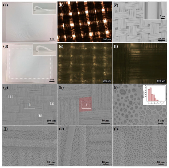 A kind of 3CPMF was first prepared via the BF technique using only commercially available polystyrene (PS) and polyester (PET) fabric. They are one of the most widely used polymers and textiles. Figure 1a and its inset show a piece of 20 cm × 16 cm PET fabric that was used. It possesses a typical woven texture composed of PET fibers, as demonstrated in Figure 1b,c. In addition, periodic voids with lengths ranging from tens to hundreds of micrometers were found to exist among the latitude and longitude of fiber bundles. A close view in the inset of Figure 1c indicates that PET fibers have a smooth surface and their diameters are approximately 15 μm. To prepare 3CPMFs, PS was first dissolved in chloroform and then introduced on a PET fabric in a high humidity environment according to the polymer weight density of 8 × 10−4 g·cm−2. Figure 1d shows a piece of PET fabric after treatment, where the modified area is framed with dash lines. The inset of Figure 1d indicates little influence on the flexibility of PET fabric after modification, and it was found that this kind of 3CPMF shows no obvious surface changes with respect to pristine PET fabrics when observed by naked eyes. In fact, however, the periodic voids were found to be well filled by the introduced PS when viewed under an optical microscope (Figure 1e). The optical microscopic (OM) images at higher magnification indicated that the fibers were decorated with elaborate microstructures (Figure 1f). A more detailed investigation was further conducted using a scanning electron microscope (SEM). At low magnification, clear woven textures, identical with pristine PET fabrics, were also observed by SEM (Figure 1g). A higher magnified image reveals that the elaborate microstructures contouring to the texture profile of fabrics were honeycomb-like porous microstructures (Figure 1h). The magnifications at different areas demonstrate that they were found to form along the profile of fibers in both longitudinal and latitudinal directions regardless of their surface complexity, including their intersections with large height differences (Figure 1j,k). The large voids were also well filled with a honeycomb porous coverage (red highlighted area in Figure 1h,i,l). In addition, its pore size is distributed from hundreds of nanometers to several micrometers, as shown in the inset of Figure 1i.