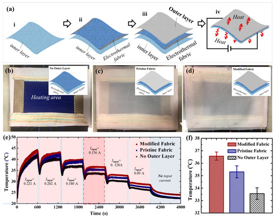 Taking advantage of the enhanced thermal insulation and well-maintained moisture permeability, PS-modified PET 3CPMFs were used to assemble a kind of ET with a sandwiched structure, as illustrated in Figure 2. A piece of soft cotton fabric was firstly used as an inner layer and placed in the bottom (Figure 2a(i)). Then, another piece of electrothermal fabric knitted with conductive silver-plated yarns and wool yarn, which acts as a Joule heating unit, was placed in the middle (Figure 2a(ii)). Its electrical resistance, measured under constant tensile force, was approximately 64.8 Ω. Finally, pristine and modified PET samples were used as an outer layer to cover the heating unit (Figure 2a(iii)). The generation of heat can be achieved by applying a power supply and can be controlled by simply adjusting its input power (Figure 2a(iv)). The assembled ETs with no outer layer, pristine PET fabric as outer layer, and modified PET fabric by the BF technique as outer layer were shown in Figure 2b–d, respectively. Their structures were illustrated in the insets of Figure 2b–d, respectively. In addition, the effective heating regions were marked with a white dash frame in Figure 2b. To quantitatively analyze the electrothermal capacity of an ET, it was placed on an insulating foam in a control box with an ambient temperature of 21 ± 1 °C and relative humidity of 80 ± 5%. Six temperature sensors were attached in the center of the inner surface of the ET and placed in the middle of the ETs and the insulating form. They were used to monitor the temperature variation of ETs in real time. Figure 2e shows the temperature variation of different ETs with time under different power supplying states. To quickly find the thermal equilibrium, the input power first turned on for heating at a given input current for 10 min (highlighted in transparent red area), and then turned off for cooling for 1 min (highlighted in transparent blue area). The given input current gradually decreased from 0.221 to 0.090 A. It was found that the temperature curve of modified fabric-based ETs was always in a higher temperature than those of pristine fabric-based ETs and ETs without an outer layer, regardless of time and input current. The temperature curves of all ETs kept a rising trend within the given 10 min when the input current was over 0.180 A, while below 0.128 A they increased first and then showed a decreasing trend. The temperature curves were found to remain horizontal at 0.156 A, indicating the achievements of systematic thermal equilibrium. Figure 2f shows a comparison of the thermal equilibrium temperatures of different ETs at 0.156 A. It is obvious that modified fabric-based ETs can achieve a higher temperature than pristine fabric-based ETs under the same input power, which demonstrates the good thermal insulation performance of CPMFs during the Joule heating process. And the good thermal insulation of materials means their excellent thermal comfort provided for human beings.