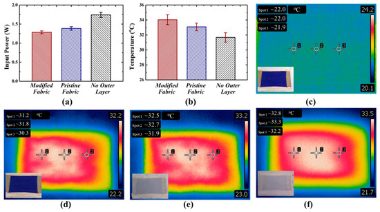 The power consumption of different ETs was further studied at the thermal equilibrium temperature of 34 °C, which is usually the skin temperature of a healthy man. As shown in Figure 3a, ETs without outer layer and pristine fabric-based ETs consumed 1.74 and 1.39 W to maintain the thermal equilibrium at 34 °C, while only 1.29 W was required for modified fabric-based ETs. It means that the PET fabrics used for ETs can save approximately 7.19% electric energy after introduction of three-dimensionally conformal porous microstructures using very few polymers by the BF technique. When fixing the input power at 1.29 W, we found that the thermal equilibrium temperatures for ETs with no outer layer and with pristine fabric can only be maintained at 33.1 and 31.7 °C, respectively (Figure 3b). Their thermal images were shown in Figure 3d–f. In contrast, a thermal image of ET, without applying an input power, was shown in Figure 3c. Correspondingly, the insets of Figure 3c–f are their regular photos. Thermal images visually demonstrated that the heating effects of all ETs after applying an input power were obvious. The measured temperatures at the center of ETs with no outer layer, pristine fabric, and modified fabrics were about 31.8, 32.7 and 33.3 °C, respectively. The temperature measured using an IR imaging system was close to the temperature monitored by temperature sensors for ETs without an outer layer, but for ETs with pristine fabric and modified fabric, the temperatures measured by the former were lower than those measured by the latter. One reason could be due to the various positions of ETs for measurement. Temperature sensors were embedded between the ETs and insulating foam for measuring the temperature of the inner surface, while the temperatures measured via IR imaging systems were at the outer surface of the ETs. Another reason can be ascribed to the thermal insulating properties of fabrics. The temperature difference caused by the pristine fabric was about 0.4 °C, while it was increased to 0.7 °C for modified fabric with three-dimensionally conformal porous microstructures of PS. These results indicate better thermal insulation of modified fabric than pristine fabric, which were well coincident with the results discussed above.