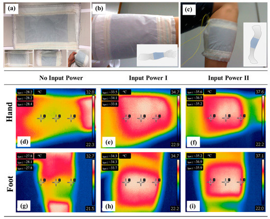 Benefiting from the choice of bio-friendly polymers and fabrics only, 3CPMFs can be directly used for the fabrication of ET devices via stitching machine for safely wearable purposes. Figure 4a and its insets show different digital photographs of a kind of wearable ET warmer using PS-modified PET 3CPMFs as the outer layer. It can be applied as an arm warmer or leg warmer to be truly put on a human body (the human subject gave his informed consent for inclusion before he participated in the study) without concerns for safety and comfort, as shown in Figure 4b,c, respectively, and Figure 4d,g show their thermal images without input power, respectively. They can effectively warm up the covering area after applying an input voltage, and the temperature of the heating area can be adjusted as required by simply controlling the input power. For example, the temperature of the heating area can be increased to approximately 34 and 37 °C after applying an input power of 1.5 W (Figure 4e,h) and 1.8 W (Figure 4f,i), respectively. This active thermal management of ETs is of great use to combat different chilly weather.