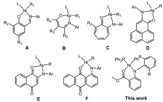 The significant interest was attracted in developing the neutral nickel catalysts because they exhibit higher tolerance toward functional polar groups [21]. Early examples of SHOP type neutral nickel catalysts have been commercialized for the synthesis of α-olefins [22,23,24]. A series of neutral nickel catalysts bearing salicylaldimine ligands (Chart 1A) was reported by Grubbs et al., which showed excellent tolerance towards polar monomers to give functionalized polyethylene [25,26,27,28]. The β-ketoiminato neutral nickel complexes with six-membered-ring were synthesized and applied as the olefin (co)polymerization catalyst (Chart 1B) [29,30,31,32,33,34,35,36,37]. Brookhart et al. successively developed the anilinotropone-based (Chart 1C) and anilinoperinaphtenone-based (Chart 1D) neutral nickel catalysts [38,39,40,41]. These nickel catalysts exhibited higher activity than salicylaldimine neutral nickel catalyst A in ethylene polymerization. Shiono et al. reported that five-membered anilinonaphthoquinone ligated neutral nickel complexes (Chart 1E) exhibited unique performances for the polymerization of ethylene and norbornene and copolymerization of ethylene with polar monomers [16,42,43,44,45]. Recently, we found that a novel six-membered anilinoanthraquinone-based neutral nickel complex promoted random copolymerization of ethylene with norbornene and polar monomers with high activity and good thermal stability (Chart 1F) [46,47]. Here, we report the synthesis, characterization, and application of six-membered neutral nickel complexes bearing anilinobenzoic acid methyl ester ligand for the ethylene polymerization and copolymerization with polar monomers to investigate the electronic effect of the ligand backbone.