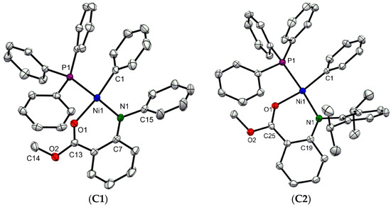 Molecular structures of complexes C1 and C2. H atoms are omitted for clarity. Selected bond lengths (Å) and angles (deg) for C1: Ni1-N1 = 1.9223 (14), Ni-C1 = 1.8841 (17), Ni1-O1 = 1.9180 (12), Ni1-P1 = 2.1758 (5), O1-Ni1-N1 = 91.14 (6), C1-Ni1-P1 = 87.12 (5); C2: Ni1-N1 = 1.932 (2), Ni-C1 = 1.891 (2), Ni1-O1 = 1.9193 (17), Ni1-P1 = 2.1816 (7), O1-Ni1-N1 = 91.33 (8), C1-Ni1-P1 = 86.59 (7).