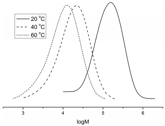 Polymerization activity is strongly depended on the polymerization temperature and the ethylene pressure. The decrease of the temperature to 20 °C resulted in the decrease of the activity in one order of magnitude (entry 5). Although activity decreased as the temperature was increased to 60 °C (entry 6), the catalyst still showed high activity of 336 kg·mol−1·h−1, indicating good thermal stability of this catalytic system. The reason for the small decrease of the activity at 60 °C could be attribute to the reduced ethylene concentration at the high polymerization temperature [51]. The molecular weight increased with decreasing the polymerization temperature, indicating that the increase of chain transfer rate is more effective than chain growth rate with rising the polymerization temperature (Figure 2). Further increase in activity and molecular weight was observed by the increase of ethylene pressure at 40 °C.
