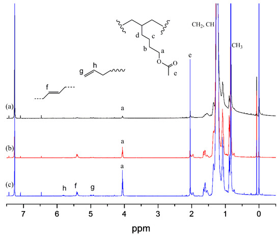 1H NMR spectra of the E-HAc copolymers: (a) 0.35 mol %; (b) 0.88 mol %; (c) 1.33 mol %.
