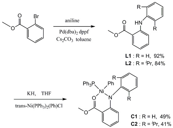 The synthesis procedure of the ligands L1–L2 and the corresponding nickel complexes C1–C2 is shown in Scheme 1. 2-Anilinobenzoic acid methyl ester ligands were easily obtained by the amination of methyl 2-bromobenzoate in the presence Pd(dba)2/dppf and Cs2CO3 [48]. The nickel complexes were prepared from the reaction of corresponding potassium salt of ligand with 1 equiv of trans-[Ni(PPh3)2PhCl] in good yields according to the literature procedure [49].