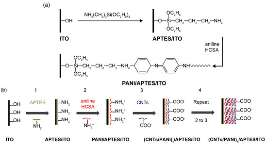 The mechanism of deposition of PANI via graft polymerization after the modification of APTES on the alkalized ITO electrode and the fabrication process of (CNTs/PANI)n/APTES/ITO electrode are shown in Figure 1. The ending –NH2 of APTES serves as an initiated site for polymerization, while the aniline monomer undergoes oxidized polymerization with the addition of HCSA. Finally, PANI is successfully grafted on the surface of ITO electrode [30]. Since PANI is in the protonated state, there are electrostatic interactions between carboxyl functionalized CNTs and amino of PANI as well as π–stacking between aromatic rings of PANI and CNTs [34].