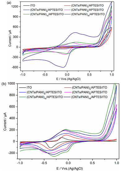 The cyclic voltammetry (CV) of ITO electrode and (CNTs/PANI)n/APTES/ITO electrode before inoculation (a) and at the end of batch tests (b) in bioelectrochemical cell with a scan rate of 10 mV/s. n = 3, 6, 8, 12 and 15.