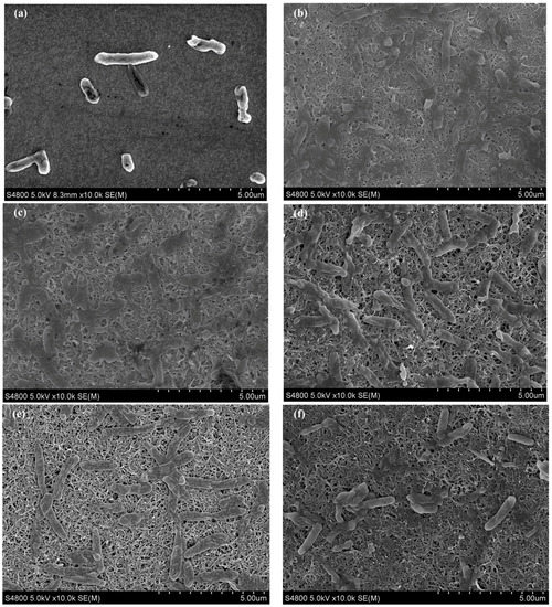 SEM images of S. loihica PV-4 cells on the surface of ITO electrode (a) and (CNTs/PANI)n/APTES/ITO electrode after 25 h of electrochemical culture (b: 3; c: 6; d: 8; e: 12; f: 15).
