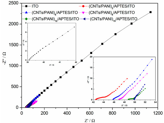 Nyquist plots on ITO electrode and (CNTs/PANI)n/APTES/ITO after 25 h of chronoamperometry (0.1–100 kHz at open-circuit potential and with a perturbation signal of 10 mV). The inset is the higher magnification of the high frequencies part. n = 3, 6, 8, 12 and 15.