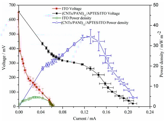 The charge-transfer resistance of MFCs, reflecting the electron transfer efficiency of the anode, can be determined from the slope of the second part of the polarization curves [35,49]. As shown in Figure 6, MFCs with CNTs/PANI film deposited ITO anode and plain ITO anode display almost the same open-circuit voltage of about +0.65 V due to the homogeneous electrolyte in MFCs [50]. As estimated from the polarization curves, the charge-transfer resistance of MFC with (CNTs/PANI)12/APTES/ITO anode is about 3.3 KΩ, which is about 3.7 times lower than that of MFC with the ITO anode. This result suggests that (CNTs/PANI)12/APTES/ITO anode has much faster electron transfer rate than ITO anode, which contributes to the improvement in power generation.