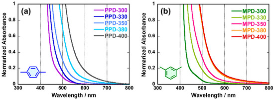 UV-Vis absorption spectra of PI films derived from (a) PPD and (b) MPD.