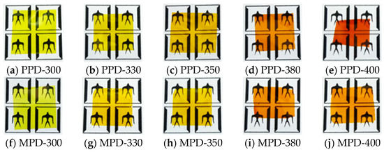 Photo images of the PI films cured at different temperatures: (a–e) PI films derived from PPD (PPD-PIs), and (f–j) PI films derived from MPD (MPD-PIs).
