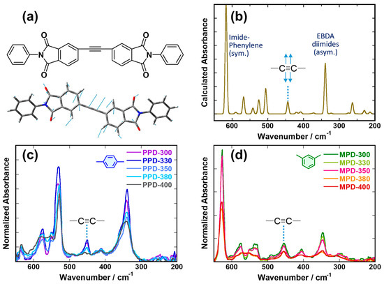 (a) Structure of a model used for DFT calculations, and the vibration mode corresponding to the symmetric rocking of the –C≡C– structure (445 cm−1); (b) calculated far-IR absorption spectrum of the model; and experimental far-IR absorption spectra of (c) PPD-PI and (d) MPD-PI films cured at different temperatures.