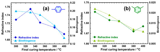 Final curing temperature dependence of average refractive indices (nav) and in-plane/out-of-plane birefringence (∆n) for (a) PPD-PIs and (b) MPD-PIs.