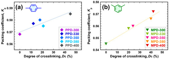Relation between the degree of crosslinking (DC) versus molecular packing coefficients; Kp for (a) PPD-PIs and (b) MPD-PIs.