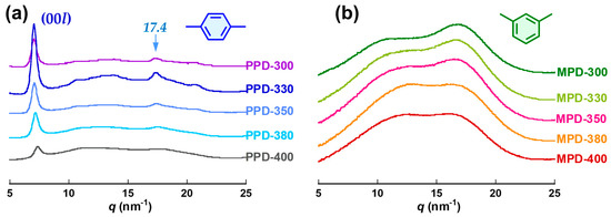 Figure 6 shows the WAXS patterns of the PPD-PI and MPD-PI films. As seen in Figure 6a, the PPD-330 film exhibited a sharper WAXS peak at 7.05 nm−1, which was assigned to the (00l) diffraction, without changes in the q value compared to the pristine (PPD-300) and other PPD films. In addition, a relatively broad peak at 17.4 nm−1, which was assigned to the (h00) or (hk0) diffraction [19], became more apparent, and the (00l) diffraction intensity significantly increased at 330 °C. This clearly indicates that thermal curing at 330 °C promoted not only crosslinking but also the formation of ordered structures. The relatively broad WAXS peaks of PPD-350, and its declined nav compared to those of PPD-330, indicate that the ordered structure was partly destroyed by the crosslinking. In general, curing at higher temperatures causes dense chain packing and promotes the formation of ordered structures, leading to increased Kp. It is reasonable that the dense aggregation structure of PPD-330 was formed under appropriate imidization and thermal crosslinking conditions. From the variation of |P200| values, the in-plane orientation of the main chains in the PI films was observed to be gradually disrupted with increasing final curing temperature. As described above, this indicates that curing at 330 °C promoted the formation of ordered structures accompanied by the reorientation of PI chains, whereas curing at ˃330 °C accelerates the reorientation of the PI chains in the ordered structures during thermo-crosslinking. In contrast, the WAXS patterns of the MPD-PI films, as shown in Figure 6b, showed only broad scatterings without any apparent peaks, indicating that the amorphous nature formed after imidization was maintained even after thermal-crosslinking at ˃330 °C. The gradual displacement of the broad peak at approximately 10 nm−1 to larger q values reflects the interchain distance shortening caused by the crosslinking reactions [20].
