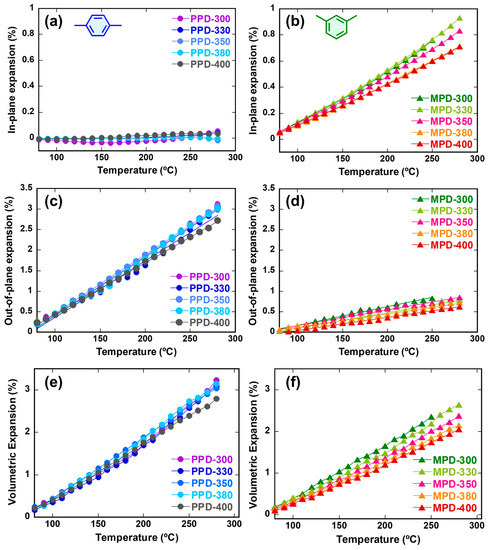 (a,b) In-plane, (c,d) out-of-plane, and (e,f) volumetric thermal expansion behaviors of PI films derived from PPD (left-hand-side) and MPD (right-hand-side).