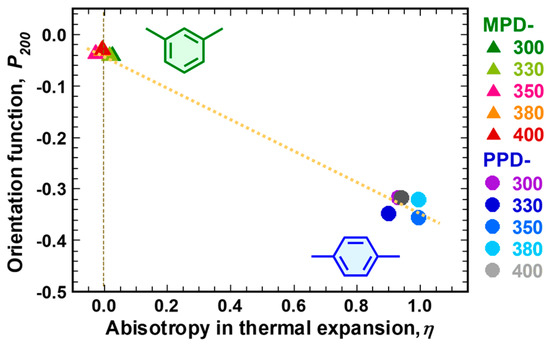 The calculated η values are listed in Table 4 and plotted in Figure 8 against the experimental P200 values. The MPD-PI films exhibited nearly random orientations (|P200| ≈ 0) with very small η values (−0.044 to +0.042), while PPD-PI exhibited a significantly higher in-plane orientation (|P200|= 0.222 to 0.317), with very large anisotropy in CTE (+0.994 > η > +0.939). The linear relationship shown in Figure 8 clearly indicates that P200 is the most significant determining factor for η, and the anisotropy in CTE can be controlled by the in-plane orientations of the PI chains. We have previously reported similar relationships [5,6]. Pottiger et al. [24] evaluated the CTE// and CVE values of commercial PI films using TMA measurements and pressure-volume-temperature (PVT) techniques, respectively, where the CTE⊥ values were estimated from the CTE// and CVE values. The authors demonstrate that the CTE// value can decrease at the expense of CTE⊥ value, because the CVE is nearly intrinsic for each polymer. They also reported that the CVE of PI films does not depend on their thickness (25–125 μm) or chain orientations. Moreover, the present study demonstrates that the CVE of PI films can be reduced by thermal crosslinking.