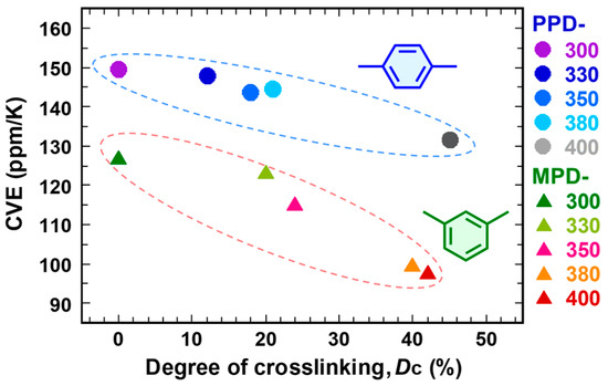 Figure 9 shows the relationship between CVE and Dc values measured for the PPD-PI and MPD-PI films. It should be noted that the CVE of the pristine MPD-300 film (127 ppm/K) is much smaller than that of the PPD-300 film (150 ppm/K). As mentioned above, we recently reported that PI films containing bent m-phenylene (MPD) linkages exhibited smaller CVEs than those containing linear p-phenylene (PPD) linkages [6]. Moreover, both PPD-PIs and MPD-PIs exhibited significant reductions in their CVEs upon thermal crosslinking. The crosslinked PI films cured at 400 °C (PPD-400, MPD-400) exhibited much smaller CVEs than those of the pristine PI films (PPD-300, MPD-300), by −18 and −29 ppm/K, respectively. This clearly demonstrates the effective reduction of the CVE by the incorporation of interchain crosslinking.