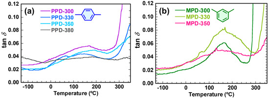 Temperature dependence of tan𝛿 of PI films derived from (a) PPD and (b) MPD.