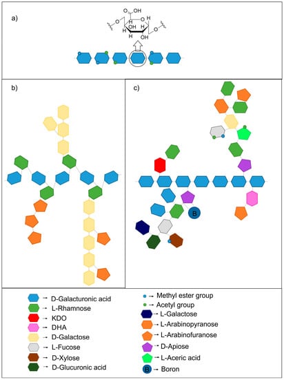 Schematic structure of pectin polysaccharides: (a) homogalacturonan; (b) rhamnogalacturonan I; (c) rhamnogalacturonan II, based on: [,,].