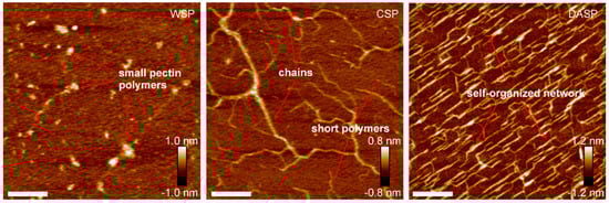 Recently, atomic force microscopy (AFM) was successfully used for the characterization of molecular structures of water-soluble, chelator-soluble, and diluted alkali-soluble pectins. The WSP fraction isolated from carrot had a high content of small pectin polymers which had a diameter and maximum height of about 22 nm and 0.2–0.4 nm, respectively []. A small number of elongated structures was observed as well. Short pectin polymers in the WSP fraction extracted from pear cell walls were also found in a study by Zdunek et al. []. Large polymers and blocks in the WSP fraction were obtained from the cell walls of fresh peaches by Zhang et al. []. Cybulska et al. showed that the polymer size in the WSP fraction (extracted from carrots) changed slightly during storage (up to about 24 nm) []. In the case of the CSP fraction from carrot roots, a mixture of both chains and short pectin polymers were observed. The skeleton length was more than 400 nm for a substantial part of the pectin chain, the molecules were also highly branched. The average value of the height of the chains was 0.21 nm. It has been suggested that rhamnogalacturonan I is attached to homogalacturonan chains forming the branched structure of the CSP fraction. The evidence for this came from FT-IR spectra representing absorbance bands at 1040, 975, and 945 cm−1 associated with the presence of galactose and arabinose residues in rhamnogalacturonan I []. Branched structures were also noted in the CSP fraction from pears []. After 3 months of storage, the length of the side chains in the CSP fraction (from carrots) was reduced and more linear and shorter chains were observed []. In a study by Kirby et al. branched structures were also found in the CSP fraction from unripe tomato cell walls []. The contour length of the molecules ranged from 20 to 540 nm. An interesting structure was elucidated for DASP embedded on freshly cleaved mica. The DASP fraction self-organized in a regular network on mica []. The height of most of the molecules was 0.8 nm and the average value of the height was 1.2 nm. Straight, long molecules with side branches were observed based on an analysis of the AFM data. The angle between the molecule and its side branch was observed to be 119°. Long molecules also had characteristic bending locations with an angle of 118°. The well-ordered network of DASP fractions was connected with these angles. It has been theorized that arabinose and galactose units occur in this fraction, based on FT-IR data []. The DASP fraction, extracted from pear cell walls, also formed a network on mica []. Typical AFM images of WSP, CSP, and DASP fractions obtained from apples (cultivar Idared) are shown in Figure 2.
