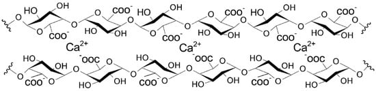 The mechanism of LM pectin gelation is related to the “egg-box” model describing the binding of Ca2+ by alginates [,]. Due to the similar structures and crosslinking behavior of alginates and pectins, the “egg-box” model was used to describe pectin and calcium ion interactions [,]. The differences in the binding processes of these polysaccharides (in chain–chain association—a pronounced shift of one galacturonate chain in relation to the other chain) were underlined by Braccini and Perez []. In the “egg-box” model, junction zones are formed by binding between Ca2+ and non-esterified galacturonic acid units []. X-ray and EXAFS studies have indicated that the interaction of calcium ions with polygalacturonate chains may occur via oxygen atoms in the carboxylate group, in the ring, in the glycosidic bond and in the hydroxyl group of the next residue []. Additionally, water molecules may interact with the calcium ions. A scheme of this model is presented in Figure 3. Gel formation at low pH (pH = 3) may be connected not only with the binding of calcium ions to pectin but also with hydrophobic interactions and the formation of hydrogen bonds []. In this case, the interaction of Ca2+ with other oxygen atoms in galacturonic acid residues was suggested.