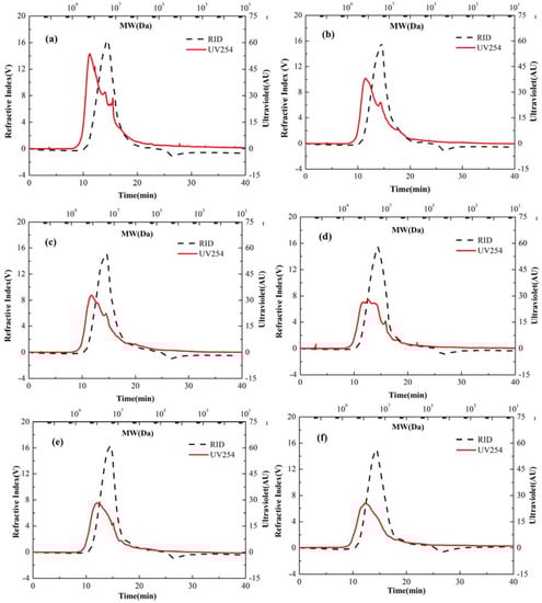 Molecular weight distribution of EPS at ozonation times of (a) 0 h; (b) 1 h; (c) 2 h; (d) 4 h; (e) 6 h; (f) 12 h.