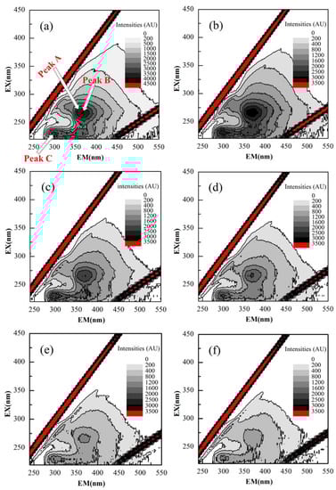 Excitation-emission matrix (EEM) fluorescence spectra of EPS at ozonation time of: (a) 0 h; (b) 1 h; (c) 2 h; (d) 4 h; (e) 6 h; (f) 12 h (Peaks A & B: Soluble microbial by-products, Peak C: Aromatic protein (tryptophan)).