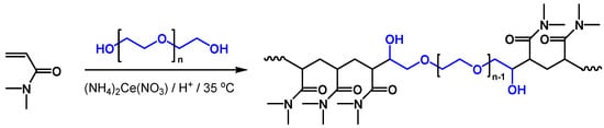 PDMA copolymers studied in this work were prepared by applying cerium ion initiated redox polymerization in mild and environmentally tolerant reaction conditions: Aqueous media, low reaction temperature, and easy products workup. The method is well known in the literature and widely used in the synthesis of graft copolymers mainly based on poly(vinyl alcohol) and other hydroxyl groups abundant polymers [27,28,29]. Di- and triblock copolymers of PEO based on a cerium ion redox system have also been reported [30,31,32]. The applied ceric ion redox system provides linear block or branched copolymer architectures in an effective one-pot one-stage synthetic procedure depending on the hydroxyl precursor and cross-linker used. Copolymer structure and composition of resulting copolymers were characterized by using conventional spectroscopic methods. Table 1 summarizes the macromolecular characteristics of the copolymers.