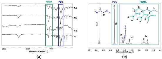 Figure 3a shows the ATRFTIR spectra of the copolymers obtained where all typical peaks of the expected copolymer constituents are visible: The strong band at 1614 cm−1 ascribed to the PDMA amide group and the peak at 1497 cm−1 assigned to H–C–H bending vibrations of the methyl group, attached to nitrogen. The band at approximately 1101 cm−1, assigned to the characteristic absorption of C–O–C groups, confirms the presence of PEO segments in P1, P3, and P4 copolymers.