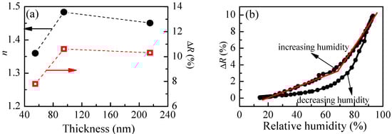 (a) Thickness dependence of P1 film’s refractive index, n, and reflectance change, ΔR, due to a change of relative humidity from 5%RH to 95%RH; and (b) Variation of reflectance with humidity of P1 thin film with thickness of 95 nm.