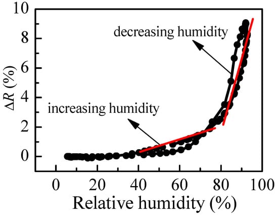 The variation of reflectance of P2 film with humidity is presented in Figure 5. It is seen that the values of R in the increasing mode of humidity are very close to the values for the decreasing mode, so the hysteresis is very weak. This is a very important characteristics of a sensor and could be regarded as a good prerequisite for using P2 polymer as an active medium for humidity sensing. In addition, two linear ranges for humidity higher than 40%RH are observed. The calculated sensitivity is 0.05% in the 40–75%RH range and increases to 0.46% for RH values higher than 80%RH. Therefore, for RH higher than 80%RH, the P2 thin film could resolve less than 1%RH. However, the P2 film is insensitive for relative humidity less than 40%RH, because no change in the measured signal is obtained in this humidity range.
