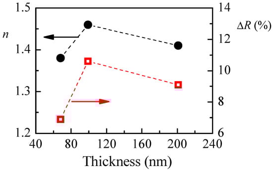 The calculated refractive index of P1 films with different thicknesses and the reflectance change when relative humidity increases from 5%RH to 95%RH are shown in Figure 4a. The smallest value of refractive index (1.36) is obtained for the thinner film. With increasing the film’s thickness, n increases and reaches a value of 1.48 for film with thickness of 95 nm. There is a small decrease of n (1.45) for the thickest film. Interestingly, the thickness dependence of reflectance change (ΔR), when humidity changes from 5%RH to 95%RH, is very similar to the thickness dependence of the refractive index, and we may conclude that there is a relationship between them. Furthermore, it is well known that the refractive index is directly related to the density of material, and the low value of n for the thinnest film means that its density is the lowest. Therefore, we could make a hypothesis that the sensitivity of polymer films toward humidity is related to some extent to their density and is higher for denser films.