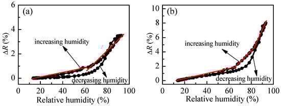 The comparison between Figure 7b and Figure 8b shows that although the hysteresis is smaller in the case of loosely cross-linked P4, branched polymer P3 is more suitable for optical sensing of humidity because its average overall sensitivity is 0.16%, while sensitivity of P4 is half that of P3 (0.08%).