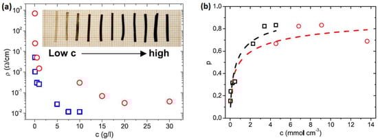 As observed in Figure 1a, a minimum in resistivity, associated with a saturation of nanocarbon absorption, was observed around 7.5 g/L and 20 g/L [] in LSCEs reprocessed with carbon black and carbon nanohorns, respectively. The swelling procedure described by Chambers et al. [,] produces LSCE films with integrated external layers of various thicknesses with a volume fraction of carbon nanoparticles (p) which is dependent on the initial nanoparticle concentration (c; Figure 1b). The mechanism of swelling/deswelling of both LCEs and LCE composites was the object of several experimental and theoretical investigations [,,,,]. Most of them refer to pristine liquid-crystalline elastomers swelled in appropriate low-molecular-mass LCs (LMMLCs) to study different geometrical distortions of the nematic director, electrical deformations, and electro-optical and mechanical properties []. Torsional actuation was studied in hierarchically patterned LCE materials under the effect of chemical vapor in view of applications as chemo-responsive systems []. LCEs swollen with nematic solvents featuring different swelling ratios still retained their main elastic properties, such as the soft and semisoft elasticity typical of LCEs []. Recent theoretical investigations [,] confirmed these findings showing potential applications of swollen LCEs as sensors, actuators, and micro-swimmers. Few studies, however, shed light on swollen LCE composites [,,,].