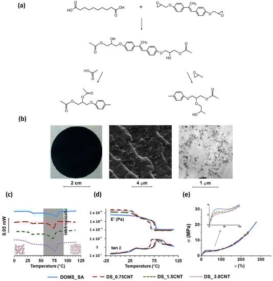 A completely different synthetic procedure was reported by Lama et al. [] to produce epoxy-based LCE composites with multi-walled carbon nanotubes (MWCNTs). The synthesis of the epoxy polymer (labeled “DOMS_SA”, Figure 2a) involves the mixing of the epoxy precursor with sebacic acid in the presence of a catalyst, obtaining a viscous mixture at 160 °C. The mixture is then poured between two Teflon-coated glasses, and is cured in the oven to finalize the polymerization. The synthesis of epoxy-based LCE-MWCNT composites implies the functionalization of the MWCNTs with the epoxy pre-polymer. The curing reaction is then performed by adding sebacic acid to the dispersion of epoxy-functionalized MWCNTs in the oven, as described for the pure epoxy polymer []. Several samples in the form of thick plates (10 mm × 10 mm × 0.25 mm) were obtained with varying nanotube content, indicated as DS_xCNT, with x = 0.75 wt %, 1.5 wt % and 3.0 wt %. An important step in the preparation of homogeneous LCE composites is represented by the functionalization of the MWCNTs and the formation of the epoxy precursor–MWCNT adducts, as revealed by the optical, SEM and TEM images (Figure 2b). The mesophase behavior of the LCE and LCE-based composites indicates the occurrence of a smectic phase (see differential scanning calorimetry (DSC) in Figure 2c). However, a concentration, x, of MWCNTs higher than 1.5 wt% destabilizes the mesomorphic behavior, as observed in other LCE composites [,,,,,]. As shown in Figure 1d and Figure 1e, both dynamic mechanical analysis and stress–strain measurements confirm the physical properties typical of liquid-crystalline elastomers. The storage modulus (E’) and dissipation factor (tan δ) indicate an increasing stiffness of the LCE composites when the concentration of MWCNT is increased (Figure 1d). Stress–strain curves (σ versus ε%) refer to the uniaxial mechanical stress applied to the rubber state of the samples, which is able to align the network. The typical soft-elasticity response of LCEs is also observed in the composites (Figure 1e). As reported and discussed in Reference [], the presence of MWCNTs has interesting effects on the thermo-mechanical behavior. In particular, at x = 0.75 wt%, the LCE-based composites show a dramatic enhancement in thermal actuation and a very high orientational order, probably due to alignment of the nanotubes along the smectic director.
