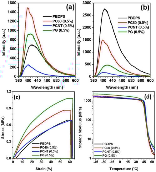 Liquid-crystalline polyesters reprocessed with various carbon nanomaterials. Fluorescence spectra of PBDPS and PBDPS/carbon nanofiller composites at concentrations of 1 mg/mL (a) and 5 mg/mL (b). Dynamic mechanical results of the testing samples: (c) recovery stress–strain curves at 40 °C; (d) storage modulus as a function of temperature. Labels: PBDPS, phenyl succinate-based main chain LC polymer; PC60, composite sample made of PBDPS including fullerene C60; PCNT, composite sample made of PBDPS including carbon nanotubes; PG, composite sample made of PBDPS including graphene. Adapted with permission from the authors of []. Copyright © 2018 Elsevier.