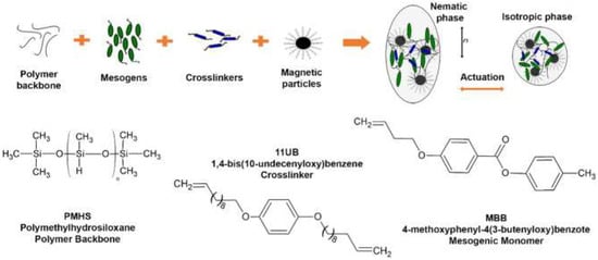 Scheme of the preparation of the composites made from magnetic iron-oxide nanoparticles and a side-chain LCE matrix. Chemical structure of the liquid-crystalline elastomer precursors: the polysiloxane chain (PMHS), the flexible cross-linker (11UB), and the mesogenic monomer (MBB). Reproduced with permission from the authors of []. Copyright © 2018 Elsevier.