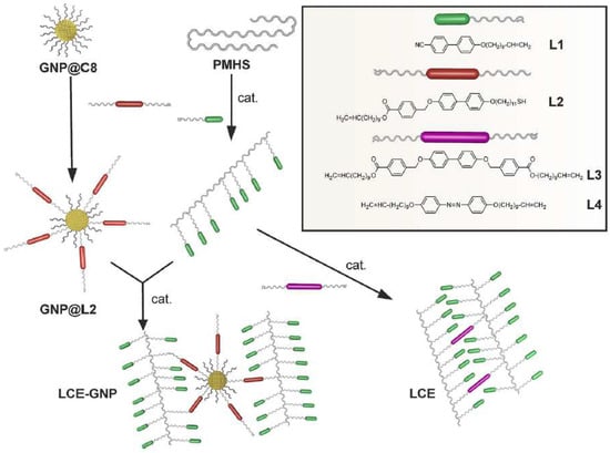 A new synthetic strategy was recently proposed by Wjjcik et al. [] to prepare LCE-based composites including gold nanoparticles (GNPs) in the LCE matrix. The approach, shown in Figure 8, consists of the synthesis of gold nanoparticles functionalized with an olefin mesogenic ligand (L2) to obtain metal nanoparticles acting as cross-linking agents (GNP@L2) for the polymer backbones (PMHS).