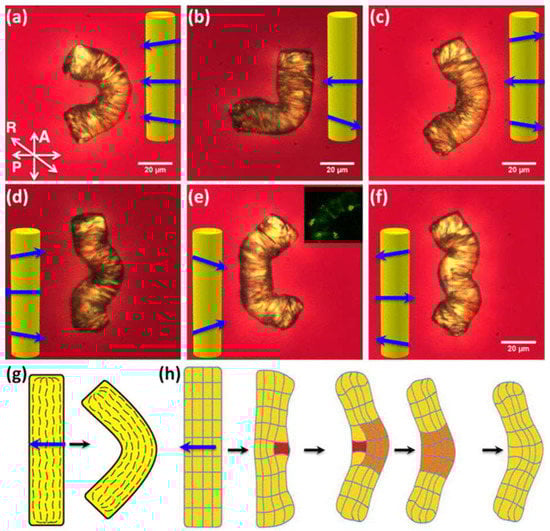 The addition of gold nanoparticles to LCEs was investigated by several groups [,,,], with the aim of producing photo-thermal effects related to the localized surface plasmon resonance of gold nanoparticles. Several works [,,] proposed the doping of LCE micro-particles or LCE micro-pillars with gold nanoparticles to induce shape deformations, rotations, and/or translations using optical manipulation. Liu et al. [] fabricated micro-sized polyacrylate-based LCEs doped with 1 wt% of gold nanoparticles (and gold nanorods), and they were able to induce a maximum strain of 30% of the initial LCE length using a laser of 635-nm wavelength. Sun et al. [] used a different synthetic approach based on a soft lithography molding technique to produce micrometer-sized cylindrical LCE actuators. They discussed the mechanism of manipulation of the shape of these colloidal birefringent elastomeric micro-particles [] using infrared laser beams and polarized-light optical tweezers. In this work [], a 1064-nm laser source was selected, since this wavelength is about double that of the maximum absorption wavelength of the pristine gold nanoparticles, thus allowing an efficient two-photon absorption process. Moreover, infrared light has several advantages with respect to visible light, since it can penetrate into the bulk of LCEs, reducing the scattering. A special profile of the local nematic director (n) was achieved by means of nonlinear optical polarizing microscopy, including coherent anti-Stokes Raman scattering polarizing microscopy (Figure 14). The shrinking of the LCE micro-particle’s length and an increase in its diameter are normally observed when heated, due to the increase in local temperature across the nematic–isotropic phase transition. When the LCE micro-particles are doped with gold nanoparticles, the same effect can be observed due to photo-thermal transfer of energy into heat. Interestingly, the shape variation of the micro-cylinder quickly relaxes back to the original shape within about one second. As demonstrated by Sun et al. [], optical manipulation of LCE micro-particles doped with gold nanoparticles can be achieved with robust and reproducible spatial (translational and rotational) control, opening up an opportunity for new technological applications.