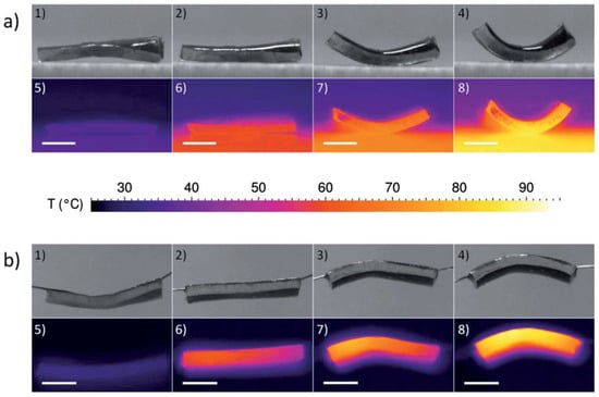 Bending actuation of LCE/ poly(3,4-ethylenedioxythiophene):poly(styrenesulfonate) (PEDOT:PSS) bilayer actuators. (a) Direct heating experiment using a Peltier element. Camera frames taken (1) at room temperature, (2) at the nematic–isotropic transition onset, (3) during the transition, and (4) at a temperature higher than the temperature transition. (5–8) Corresponding thermal infrared camera images. (b) Joule heating experiment. Camera frames taken at (1) room temperature, (2) at the nematic–isotropic transition onset, (3) during the transition, and (4) at a temperature higher than the temperature transition. (5–8) Corresponding thermal infrared camera frames (scale bar: 1 mm). Reproduced with permission from the authors of []. Copyright (2018) The Royal Society of Chemistry.
