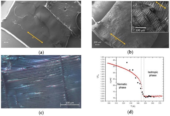 SEM images showing the surface of the LCE/PEDOT:PSS composite (a) before and (b) after heating at T ≈ 73 °C. Direction defining nematic director (n) alignment is shown as an orange arrow. Inset at left of image (b) shows a closer view of the surface in which uniaxial microwrinkles are formed and organized in a domain-like arrangement. (c) Image of the surface of the LCE/PEDOT:PSS composite, observed using an optical microscope. The temperature of the sample is about 75 °C, i.e., in the isotropic phase. Horizontal and parallel wrinkles, as well as vertical breaks, are clearly visible. (d) Wrinkle wavelength (λ) as measured by observing several images of PEDOT:PSS/LCE composites using an optical microscope (black squares) during the second cooling process, in the temperature range of 90–52 °C. Thermo-mechanic elongation (L/L0) of the pristine LCE film (red circles) during the second cooling run. Vertical dot lines are added in order to put in evidence the isotropic–nematic phase transition. Reproduced with permission from the authors of []. Copyright (2018) Taylor & Francis.