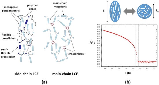 In common macroscopically aligned (monodomain) LCEs, mechanical deformation is induced by increasing (or decreasing) the temperature across the disordered–ordered phase transition and vice versa (Scheme 1b) []. However, the perspectives of applications of these materials could be widely expanded if the reversible shape variation was induced by stimuli other than temperature, such as, for instance, external electric or magnetic fields, as in common electro-active polymers [,,]. Another possibility, explored by several research groups, is the preparation of photosensitive LCEs, in order to modulate the shape deformation and morphing geometries by means of UV-vis or infrared (IR) light stimuli [,,,,]. These are the two main directions of development in the field of LCE-based materials.