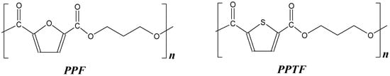 The as-prepared samples appeared as yellowish hard solid materials; the purified ones were white floccules. Their chemical structures are shown in Figure 1: As can be seen, the two homopolymers display a similar chemical structure, being both aromatic polyesters with same glycol sub-unit, although differing for the aromatic acid sub-unit, containing a furan ring in the case of PPF, and a thiophene one in PPTF.