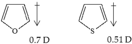 The two heteroaromatic five-membered rings are characterized by some differences, first of all, the resonance energy has a different value: 6.2 Kcal/mole for furan and 29.1 Kcal/mole for thiophene, respectively. The resonance stabilization of heteroaromatic molecules depends on several factors, which arise from the atomic features of the heteroatom and result in different molecular properties. The ability of one of the heteroatom’s non-bonding electron pairs to participate in the aromatic π-system is critical. Oxygen, being highly electronegative, shares its non-bonding electron pair less willingly than sulfur. Sulfurs’ lower electronegativity, a result of its larger size and hence softness, permits greater participation of its non-bonding electron pair to the aromatic π-system. Therefore, the furan ring is the least aromatic, because of the highest electronegativity of oxygen. Analogously, the electronegative character of the heteroatoms determines a dipolar moment on the ring, the negative pole being located at the heteroatom. Once again, the dipole moments of furan and thiophene are different and function of the heteroatom electronegativity: The higher the electronegativity, the higher the dipole moment (Figure 2).