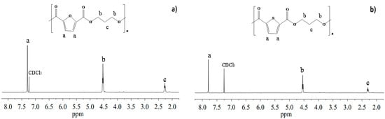 As far as the two polyesters under investigation are concerned, 1H-NMR analysis confirmed the expected structure (Figure 3) with no impurities in the spectrum. Both polymers are characterized by high and similar molecular weight and by same narrow polydispersity index (Table 1), proving that optimized reaction conditions were achieved.